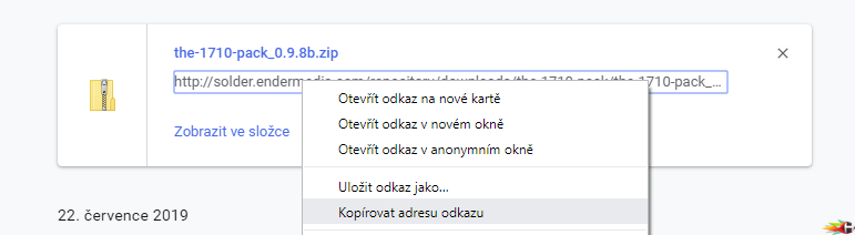Často můžete přímou adresu souboru získat i bez toho, abyste soubor začli stahovat, a to tak, že zkopírujete odkaz, který se otevře po kliknutí na odkaz, po kterém se soubor začne instantně automaticky stahovat (což například není u CurseForge, tam se po kliknutí na tlačítko Download čeká), viz obrázek níže