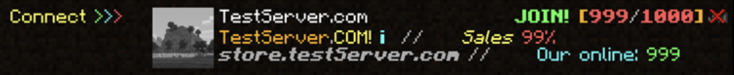 Na MOTD ale můžete využít i plugin, který nabízí více funkcí, jako dynamické MOTD, podporu HEX (RGB) barev, či text nalevo od ikony, jak je ukázáno na obrázku níže. MOTD pluginy mívají i funkci pro dynamický (či falešný playercount) a ukázání vlastního textu při hoveru.